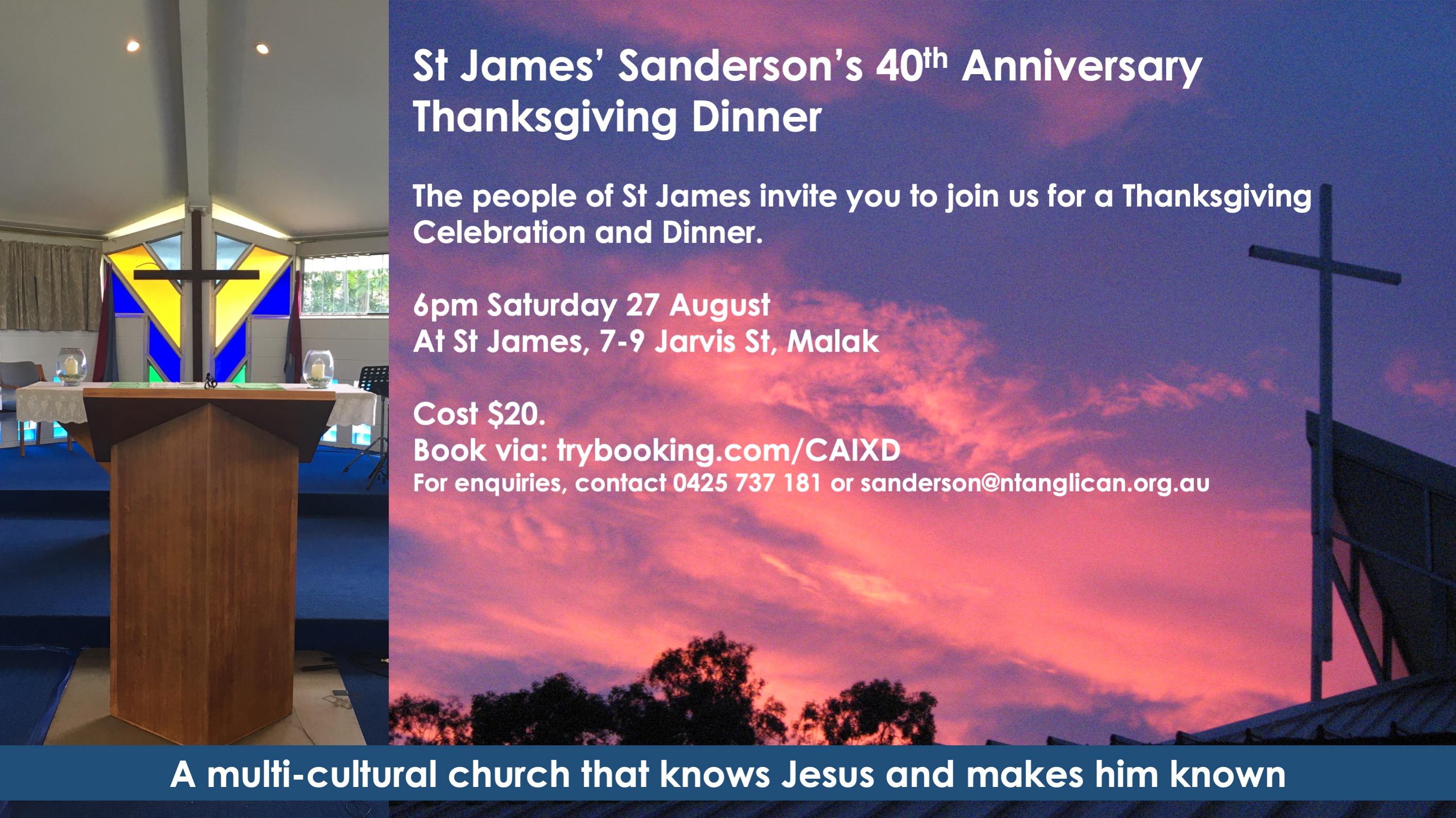 40th Anniversary Thanksgiving Dinner Posted on 27/07/2022 by St James Anglican Church, Sanderson Reply https://www.trybooking.com/events/landing?eid=919961&