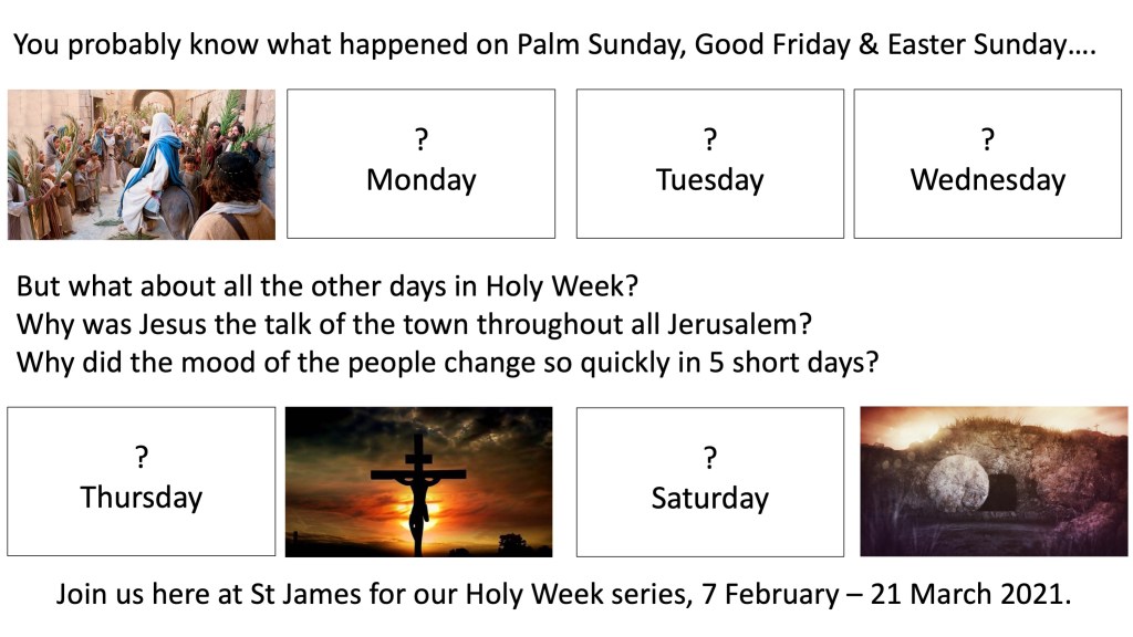 A 4-week series on Prayer runs 11 April – 2 May, followed by a run of “annual” Sundays including Mothers Day, Ascension Sunday, Pentecost and Trinity Sunday.