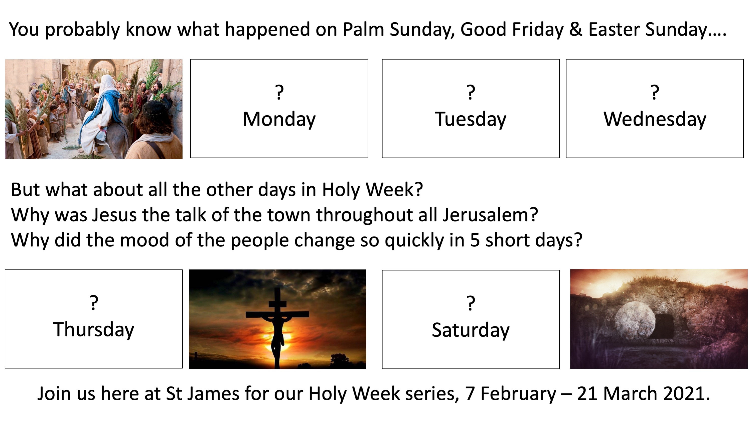 A 4-week series on Prayer runs 11 April – 2 May, followed by a run of “annual” Sundays including Mothers Day, Ascension Sunday, Pentecost and Trinity Sunday.
